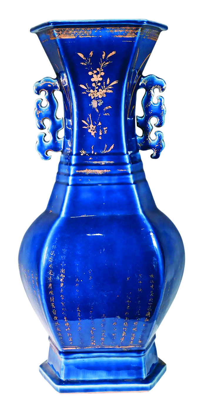 文物名片 主角:蓝釉描金花卉诗文双耳瓶 出生时间:清代 尺寸:高56.5厘米、口径21.5厘米、腹径27厘米 藏宝地:盐湖区博物馆