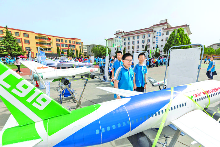 ▲5月17日,运城市实验中学学生参观该校航模社团学员作品。