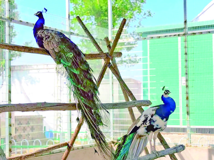 每日清晨,园区内的孔雀昂首阔步,舒展自己五彩斑斓的尾翼;火鸡扑棱着翅膀,发出欢快啼鸣,二者与园内古朴建筑、葱郁树木共同绘就一幅动静相宜的画卷。