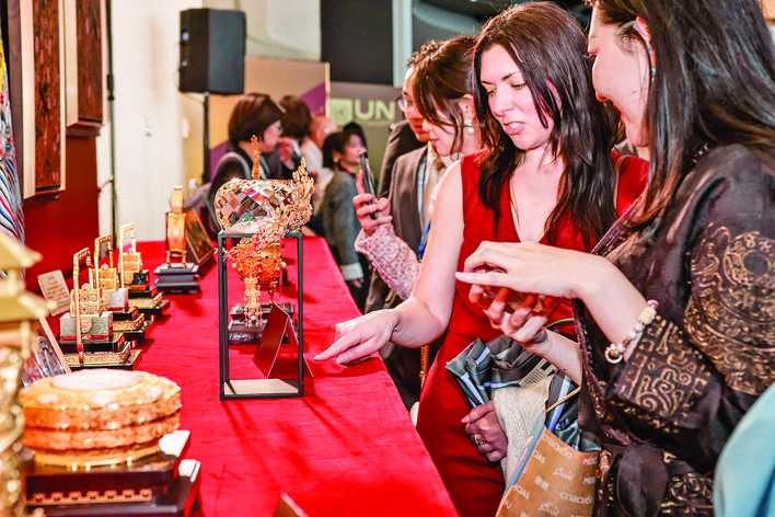 ◀5月19日,在位于纽约的联合国总部,人们参观故宫文创展。 “生生不息——故宫文创走进联合国主题展”开幕式暨故宫博物院成立100周年邮票发布仪式19日在联合国总部举行,120余位各国驻联合国大使及国际组织代表参加。 新华社发