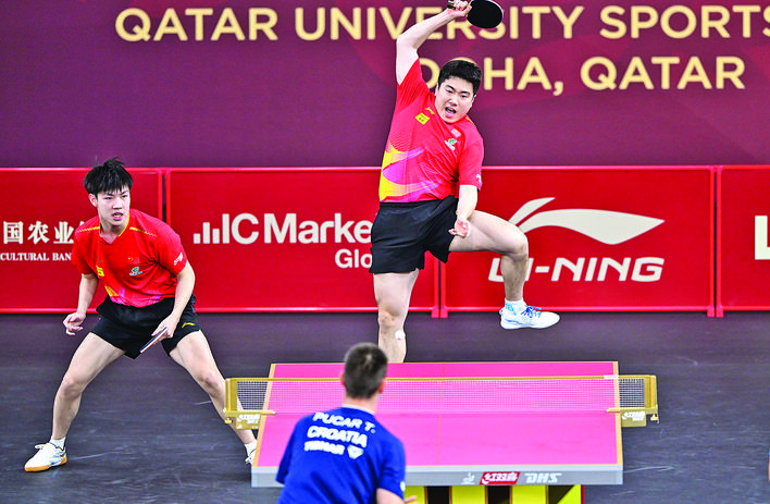 ▲5月19日,梁靖崑(右)/黄友政在比赛中。 当日,在卡塔尔多哈举行的2025世界乒乓球锦标赛男子双打第二轮比赛中,中国组合梁靖崑/黄友政3比1战胜约奇克(斯洛文尼亚)/普卡(克罗地亚),晋级16强。 新华社记者
