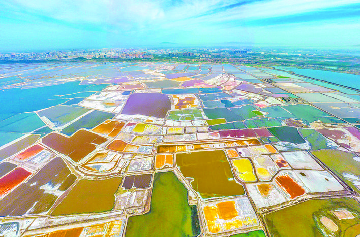 按照老陈的指引,我来到了目的地。堤埝分割出大小不一的水面,像一幅被晕染开的水彩画:有泛着珍珠光泽的浅白卤水,有透着琥珀色的结晶池,也有的因藻类初绽,泛起若隐若现的浅粉。