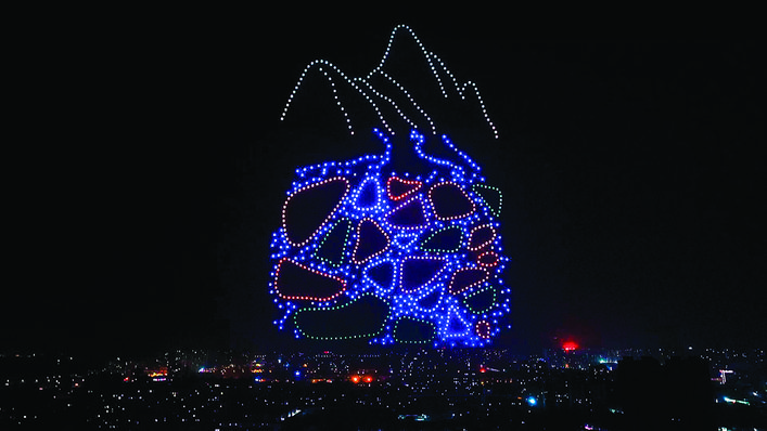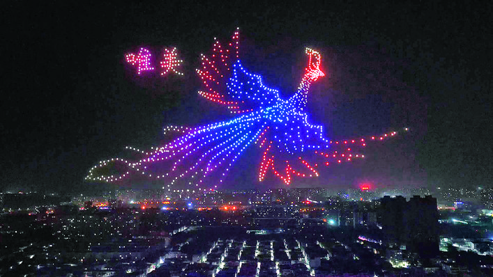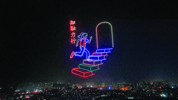 夜幕初垂,千架无人机腾空而起,在夜空次第变幻出盐湖、条山等运城标志性元素,以及“唯美、笃学、崇德、尚智”等校训字样。四层色彩交叠辉映,光影流转间将地域文化、校园精神与现代科技深度融合。“从无人机轰鸣升空的瞬间,就被眼前的壮观景象震撼了。”该校教师杨帆难掩激动,“这些图案不仅展现了科技魅力,更传递出浓厚的文化底蕴。”