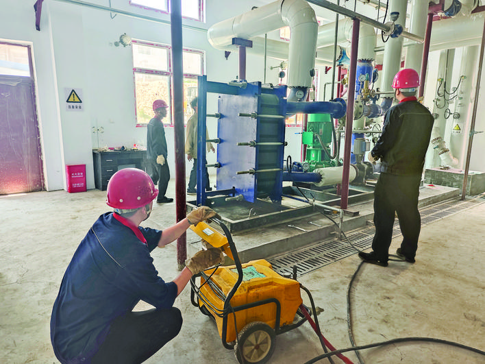 当天下午,在中心城区合欢花园小区换热站内,该公司管线及维检部维检班组成员在对换热站板换进行打压测试。“这座换热站的板换已经清洗完毕,我们利用专业打压设备来测试其承压能力。结合这个换热站的实际供热情况判断,压力达到1.2即证明测试成功。”该公司管线及维检部维检班长高宁波说。