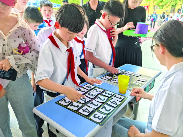 “闯关成功!”5月27日,二年级9班的张悠皓刚刚完成扑克牌速算的挑战,他需要先将牌面上的数字做加法,然后由教师随机抽走一张牌,重新计算,在规定时间内答对被抽走的扑克牌数字。在游戏中,课堂知识得以巩固,学习兴趣被进一步激发。“我喜欢这样的数学游戏,解密过程有趣好玩,我一会儿还准备玩其他游戏,争取全部通关。”张悠皓说。