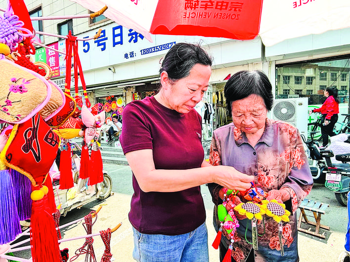 苏香串的手艺也激活了全家的手工基因。女儿柴玉琴在工作不忙的时候会帮母亲摆摊位,儿媳妇则是家里的又一位“手工达人”,在网上看教程就能编出各种款式的五彩手绳,还能按顾客需求定制长度。就连家中的小辈孩童,也会拿着碎布头给布娃娃做“迷你香包”。每逢周末,老人还会跑到解州关帝祖庙门口摆摊,那小小的摊位也成了他们的“家庭工坊”,“妈妈缝香包,弟媳妇编手绳,我则帮着招呼客人,一家人热热闹闹的,就把这些心意传递给大家了。”柴玉琴说。