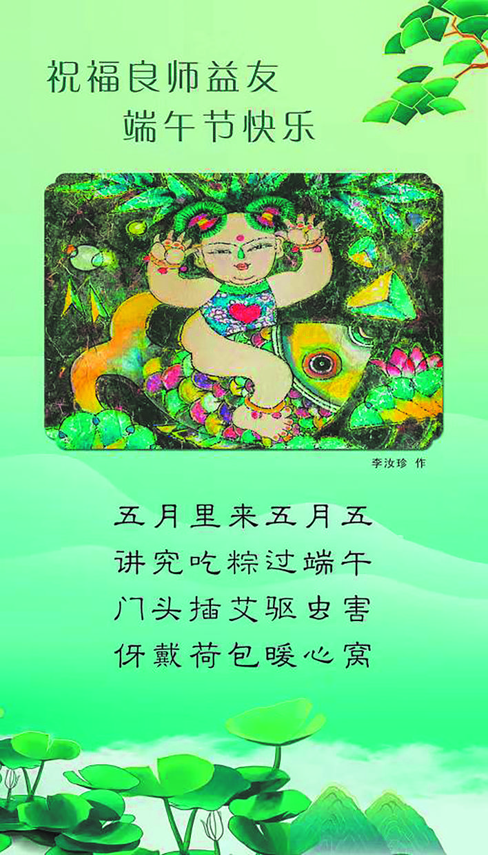 五月里来五月五,讲究吃粽过端午。门头插艾驱虫害,伢戴荷包暖肺腑。 □李汝珍 作