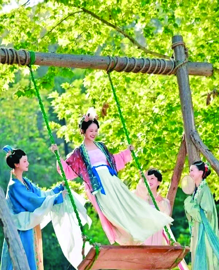 ▲鹳雀楼古风秋千体验 记者 李婉玉 摄