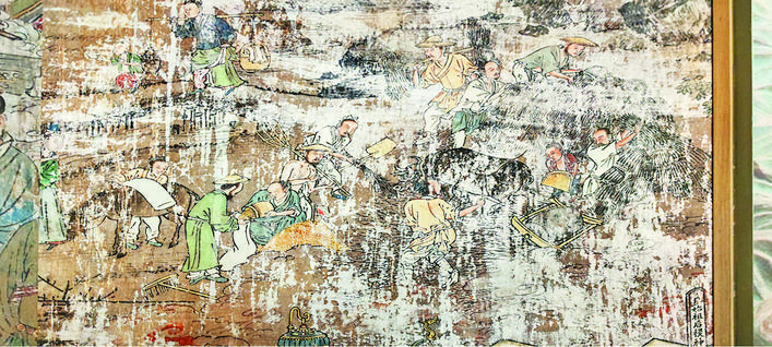 ▲新绛稷益庙壁画中的农民收获场景 记者 刘亚 摄