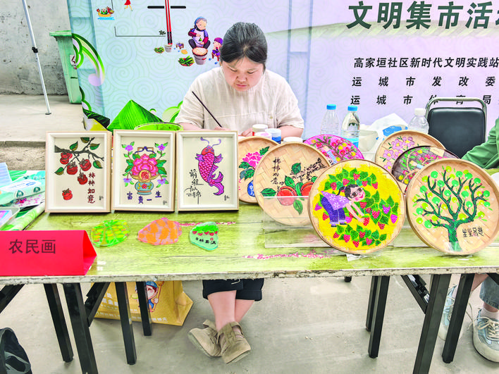 文明集市,让居民感受到中华优秀传统文化的魅力。“我第一次知道农民画这一类别。它主要是由农民创作,带有乡土气息,通过淳朴夸张的手法来反映农村的新风貌、新变化,让人感受到蓬勃向上的生命力。”市民杨先生说。
