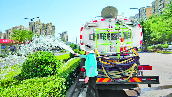 “这几天天气炎热,水分蒸发快,我们根据天气和苗木缺水情况,合理调整浇水频次和浇水量,确保每一株植物都能‘喝’饱水。”正在作业的园林工人赵师傅一边擦拭着额头的汗水,一边说。