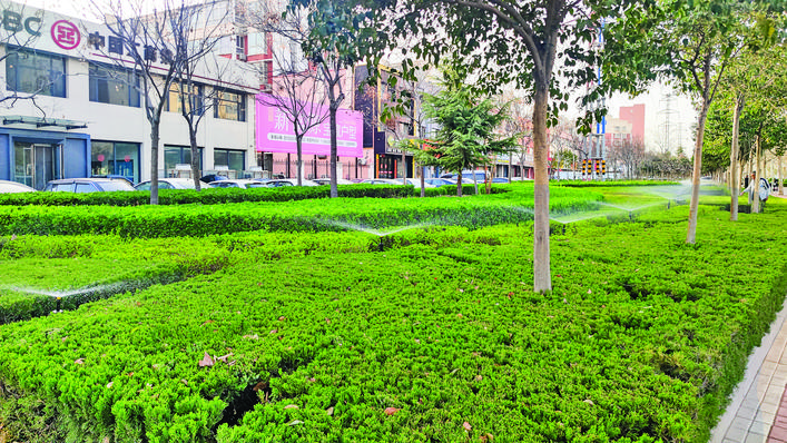 随后,在人民北路一处绿地内,记者看到智能浇灌设施均匀地喷出细密的水雾,滋润着周围的绿篱。据了解,中心城区智能浇灌系统如今已覆盖10条街道,该系统能够根据环境湿度、土壤水分等因素,远程调节浇水量和浇水时间,可以使灌溉工作更加智能、精准、高效。