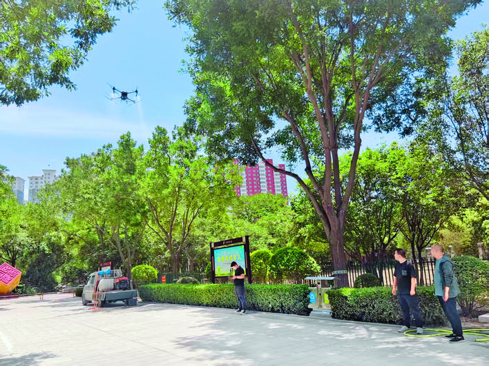 除了抗旱保苗,病虫害防治工作也在同步推进。自5月16日起,该中心针对河东街、铺安街等重点道路的苗木,启动了无人机“飞防”作业。在专业技术人员的操作下,无人机在空中穿梭,将防治药剂均匀地喷洒在树木顶端和密集冠层,为树木搭起病虫害“防护罩”。此外,为防治蚜虫、红蜘蛛等病虫害,该中心各片区管护部园林工人还利用小型打药车进行精准防治,确保苗木能够健康生长。