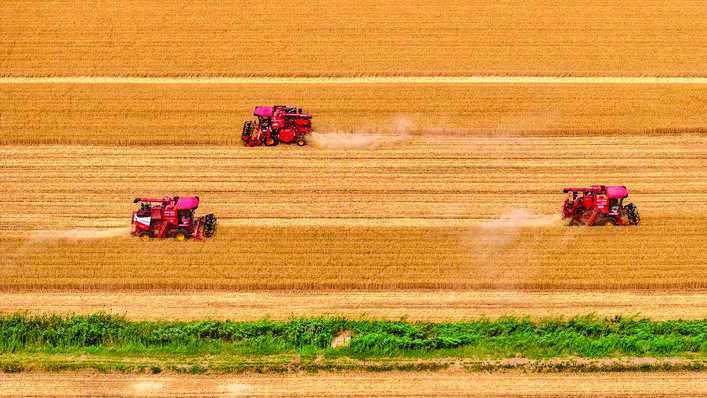 ▲6月5日,在嘉祥县仲山镇,收割机在收获小麦。 “三夏”时节,山东省济宁市嘉祥县68万亩小麦陆续成熟,当地农民抢抓晴好天气收获小麦、播种秋粮,田间地头一派农忙景象。