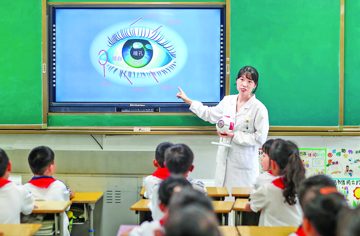 ▲6月5日,在江苏省兴化市景范学校,医护人员为学生讲解护眼知识。 全国爱眼日将至,各地开展形式多样的活动,普及健康用眼知识,增强爱眼护眼意识。