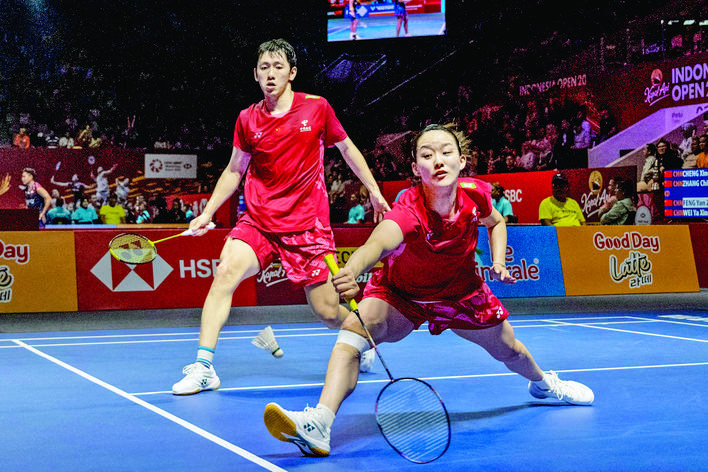 ▲6月5日,程星/张驰(右)在比赛中。当日,在印度尼西亚雅加达举行的2025印尼羽毛球公开赛混合双打第二轮比赛中,中国组合程星/张驰2比0战胜队友冯彦哲/魏雅欣,晋级八强。新华社发(维里 摄)