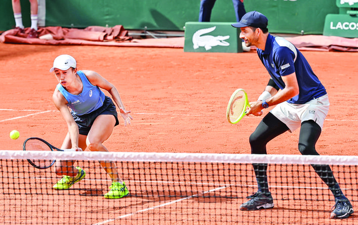▶6月4日,张帅(左)/阿雷瓦洛在比赛中。 当日,在巴黎进行的2025法国网球公开赛混双半决赛中,张帅(中国)/阿雷瓦洛(萨尔瓦多)0比2不敌意大利组合埃拉尼/瓦瓦索里,无缘决赛。