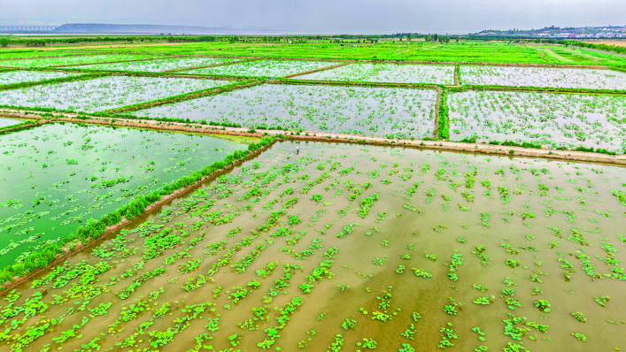 ▲夏日的万荣滩涂,荷塘与蓝天、远山相映,勾勒出温婉可人的湿地景致,好似江南水乡一般,令人神清气爽。特约摄影 解建国