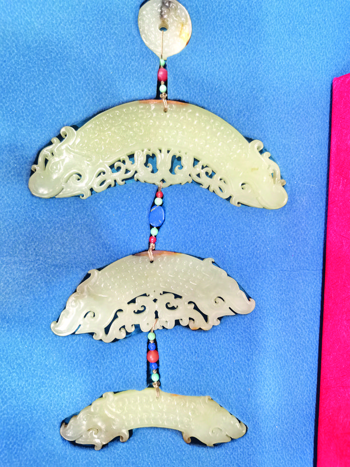 ▲和田玉三联龙头玉璜