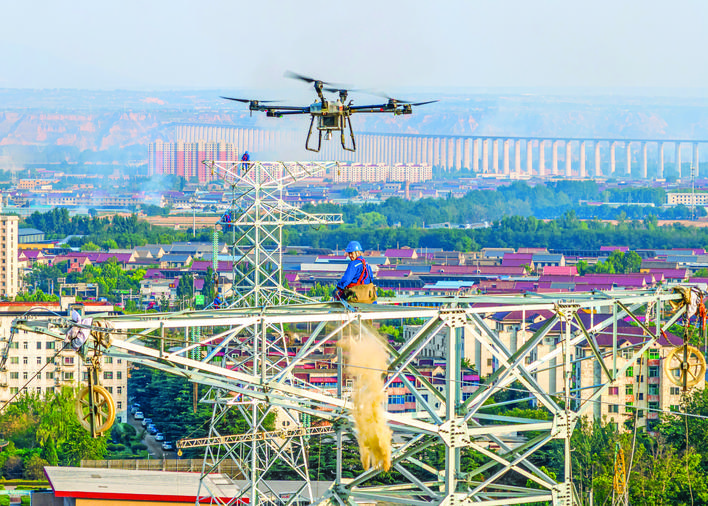 ▲6月11日,在河津西220千伏输变电工程现场,国网运城供电公司施工人员正利用无人机放线作业。