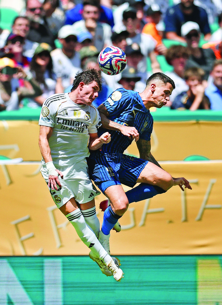▲6月18日,皇家马德里队球员弗兰·加西亚(左)与利雅得新月队球员坎塞洛在比赛中争顶。 当日,在美国迈阿密进行的2025年国际足联俱乐部世界杯(世俱杯)H组小组赛中,西班牙皇家马德里队1比1战平沙特利雅得新月队。 新华社记者 李明 摄
