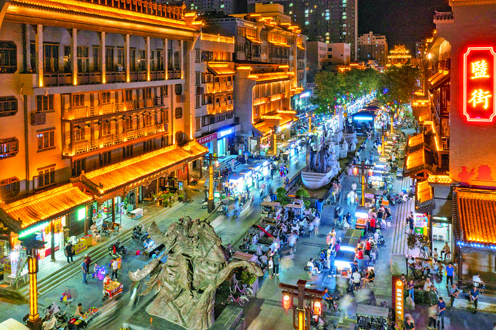 ◀6月29日,市民、游客在中心城区盬街往来穿梭,热闹非凡。 近年来,我市不断丰富夜间经济消费业态,将夜间美食、夜间娱乐、夜间购物等多个场景有机地结合起来,助力点燃城市“烟火气”,点亮城市“夜生活”。
