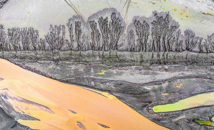 ▲7月9日,在平陆县黄河岸边拍摄的形状似树的“沙画”景观。
