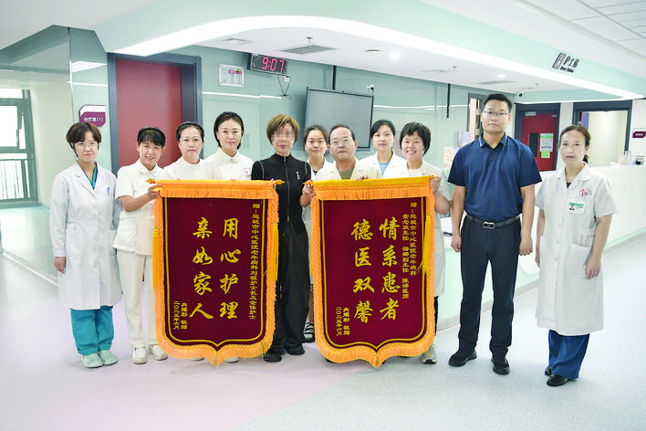 患者家属冉女士握着医护人员的手,声音几度哽咽:“锦旗我们准备了很久,就是想让你们知道,你们的付出我们全家永远不会忘记!”这不仅是患者家属的深情致谢,更承载着一段医患携手与病魔抗争、传递人间大爱的感人故事。