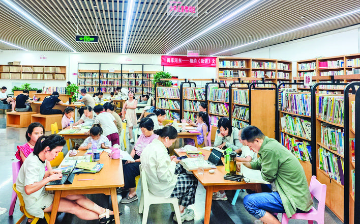 这个占地700平方米的书房,是许多市民夏日里的“精神避暑地”。阅读区里,孩子们围坐在绘本架旁,有的低声讨论着故事情节,有的趴在小桌子上写写画画;年轻人对着电脑专注地学习、工作;老年人戴着老花镜研读书页上的内容,大家在墨香与清凉中享受着轻松的“充电”时光。