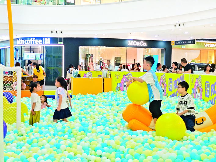 商场一楼的儿童游乐区内,彩色的球池与滑梯吸引了不少儿童嬉戏玩耍,欢笑声不绝于耳。家长们站在一旁耐心陪伴,既享受着商场内的清凉,也见证着孩子的欢乐时光。