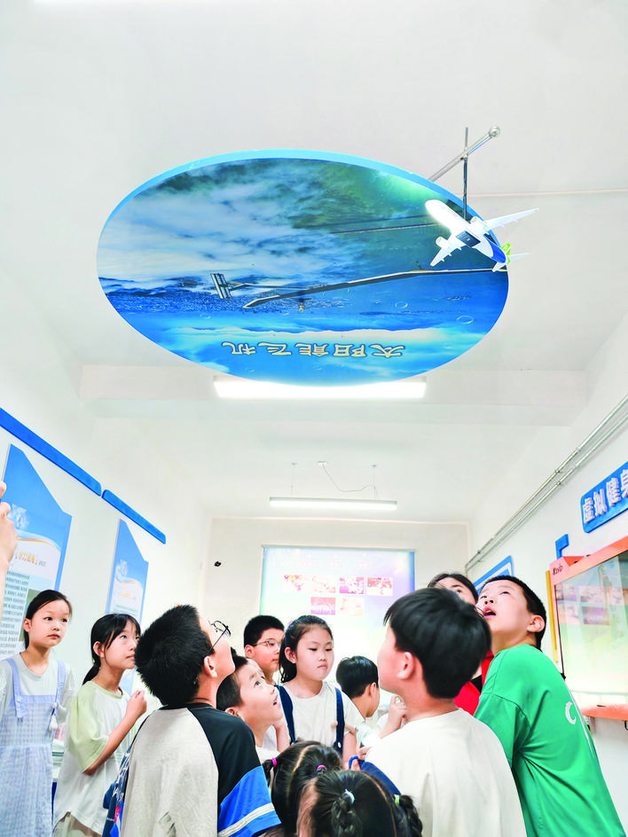 当展示太阳能飞机模型时,孩子们纷纷惊叹:“宇宙太美了,我长大想当宇航员!”