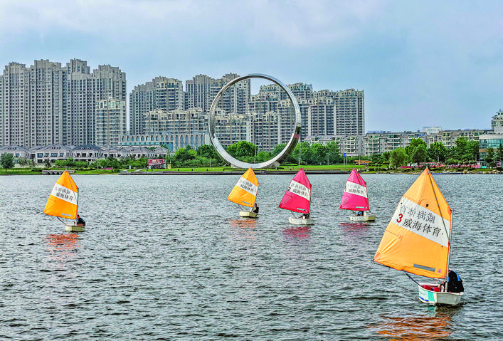 ◀7月16日,在山东省荣成市樱花湖体育公园水域内,青少年进行帆船练习(无人机照片)。 暑假期间,孩子们参加丰富多彩的活动,乐享假期生活。 新华社发(李信君 摄)