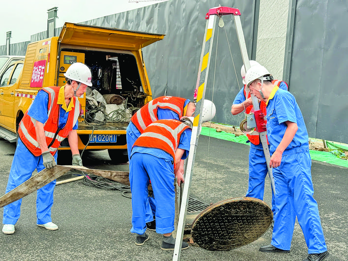 降雨结束后,收回设备并复原井盖,全面清扫恢复路面整洁。待到路面积水下降至安全水位,应急抽排组人员会立即关停泵车,由防汛抢险组和现场警戒组用工具清除堵塞在雨水井盖上的杂物,并将打开的检查井盖全部复原,确保道路通行安全。最后,防汛抢险人员将所用设备收集完毕,现场清扫组人员对路面的淤泥、垃圾等进行冲刷清理,确保路面不留脏污。