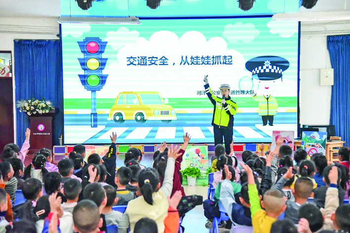 ◀近日,河津公安交警宣传民辅警走进辖区机关幼儿园,开展了一场别开生面的交通安全宣传教育活动,积极推进“大排查、大整治、大宣传”百日行动。