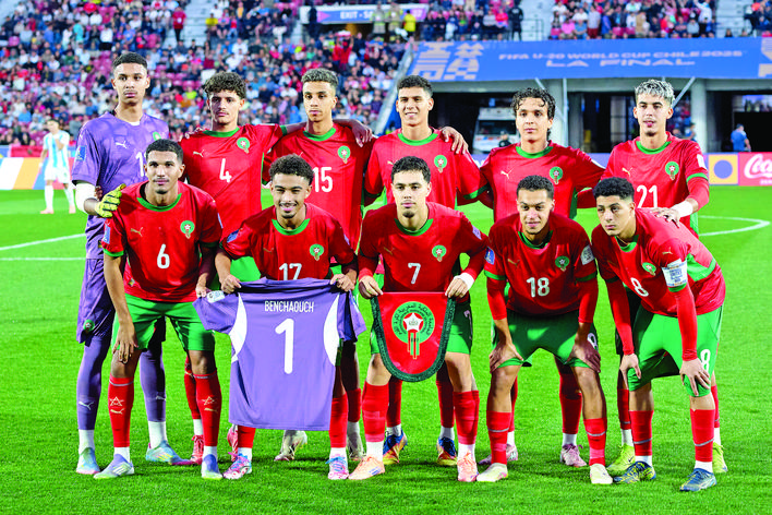 ▶10月19日,摩洛哥队在颁奖仪式上庆祝。 当日,在智利圣地亚哥进行的2025国际足联U20男足世界杯决赛中,摩洛哥队2比0战胜阿根廷队,获得冠军。 新华社发 (豪尔赫·比列加斯 摄)