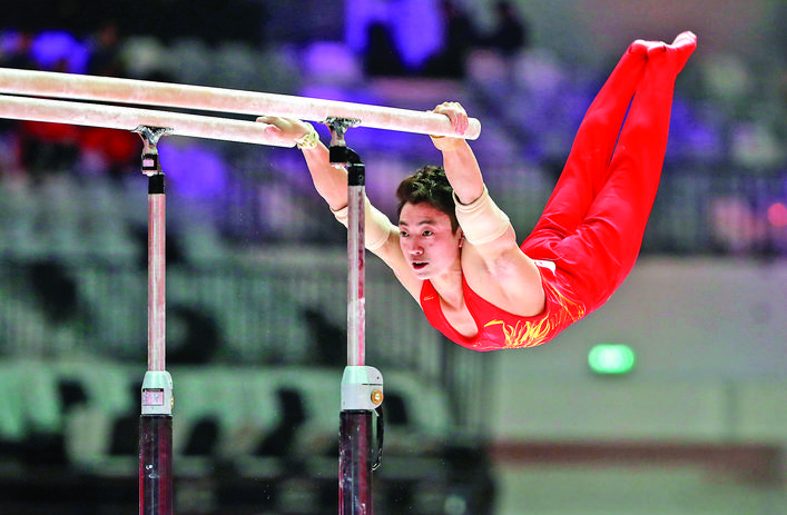 ▶10月20日,邹敬园在男子资格赛双杠项目比赛中。 当日,在印度尼西亚雅加达进行的2025年国际体操联合会(FIG)竞技体操世锦赛男子资格赛中,中国男队登场亮相。