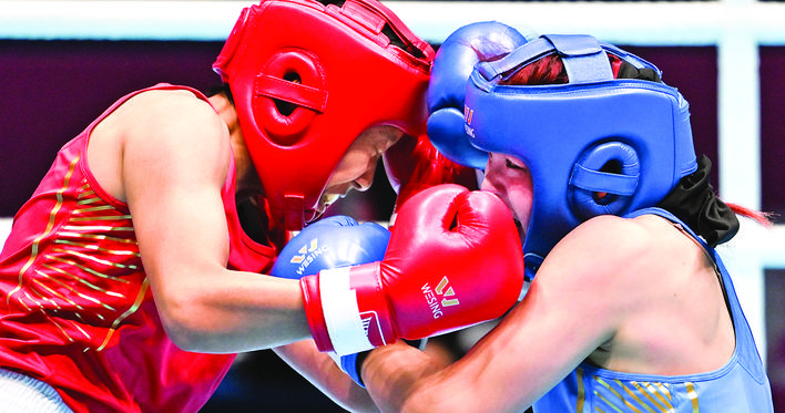◀11月12日,禹立赛(右)与李书在比赛中。 当日,在深圳进行的第十五届全国运动会拳击女子66公斤级决赛中,北京体育大学队选手禹立赛战胜河南队选手李书,获得冠军。