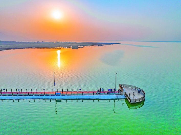 位于盐湖区解州镇西元村的女盐池生态景观廊道,以红绿蓝白四色步道串联起湖光山色,蜿蜒的彩虹步道与湖中栖息的水鸟相映成趣,构成人与自然和谐共生的美丽画卷,成为我市生态文旅新亮点。