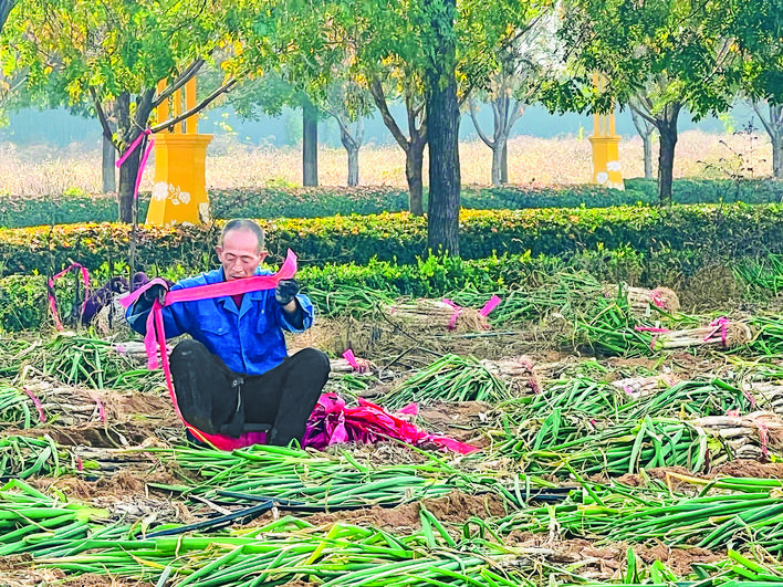 ▲11月11日,万荣县解店镇七庄村村民在收获大葱。