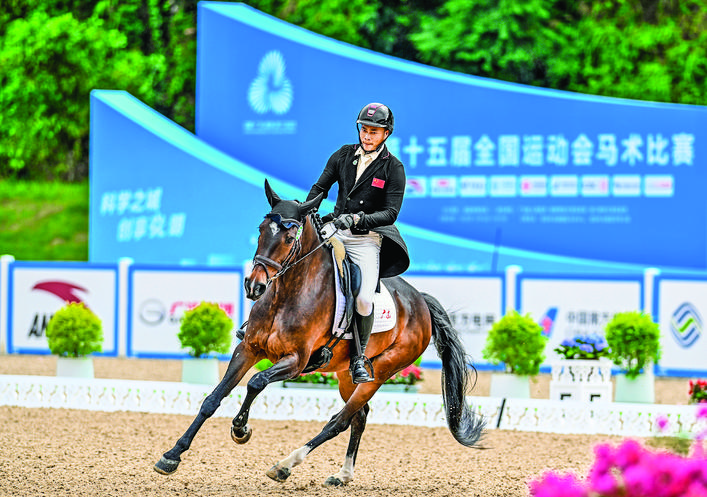 ▶11月13日,广东队选手梁锐基和马匹“凯丽”在比赛中。他在个人赛中排名第一,广东队在团体赛中排名第二。当日,第十五届全国运动会马术三项赛团体赛决赛(个人资格赛)盛装舞步在广东深圳光明国际马术中心举行。 新华社记者