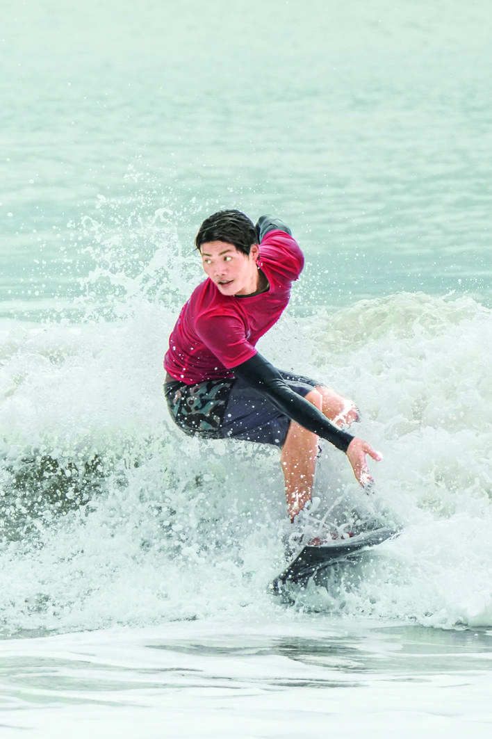 ▶11月13日,海南队选手王成征在比赛中。他以12.17分的成绩晋级十六强。 当日,第十五届全国运动会冲浪项目男子短板第一轮比赛在广东南澳举行。