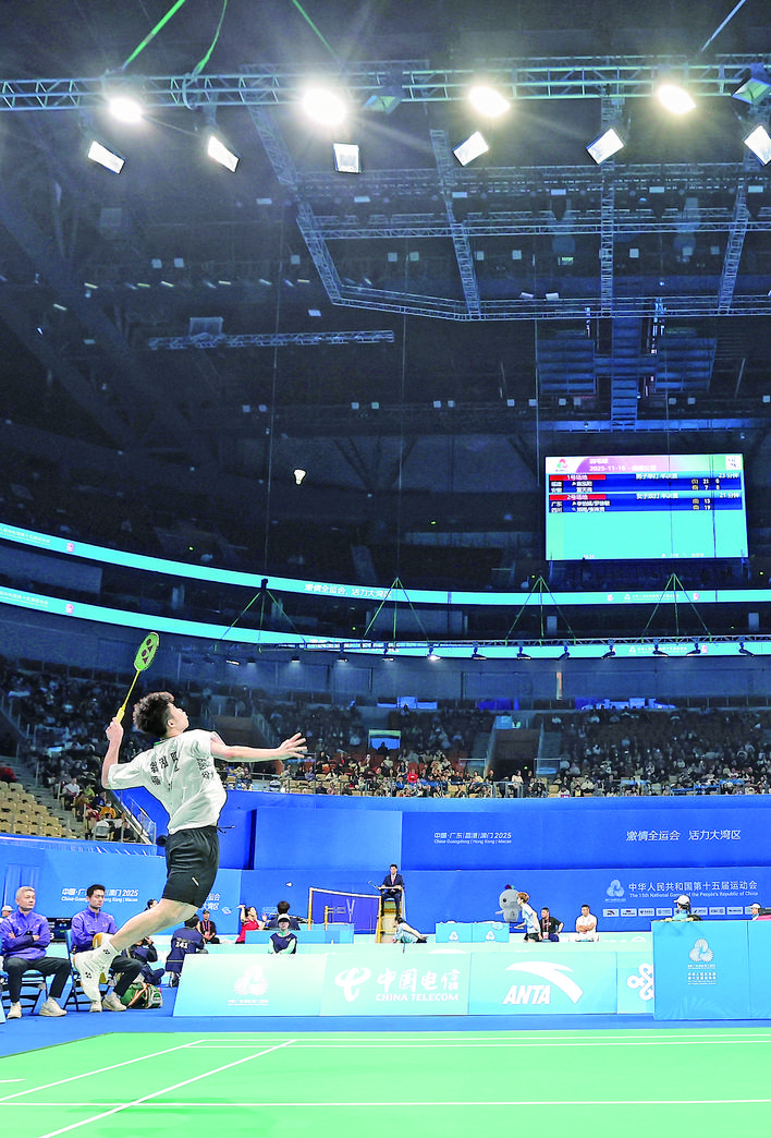 ▶11月18日,福建队选手翁泓阳在比赛中回球。当日,在深圳举行的第十五届全国运动会羽毛球男子单打半决赛中,福建队选手翁泓阳2比0战胜安徽队选手董天尧,晋级决赛。