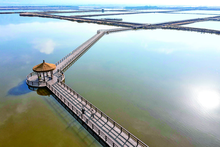 ◀11月23日,市民在盐湖亲水观光木栈道游玩。 近期天气晴好,不少市民来到木栈道,近距离感受盐湖美景。