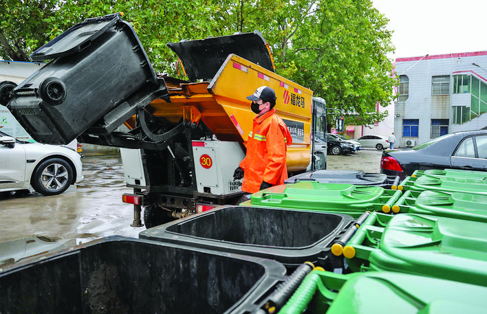 ◀福龙马环境卫生管理(运城)有限公司的工作人员在盐湖区东城街道工行培训中心收集生活垃圾。该公司工作人员每天按区域对各点位的生活垃圾进行3次收集和转运。