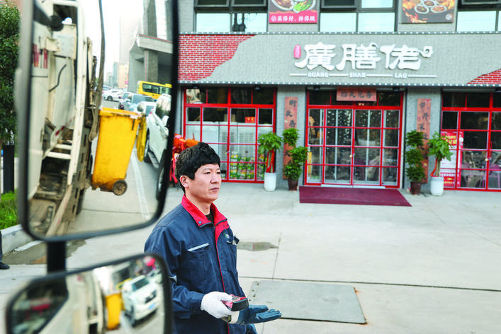 ▲山西中鑫环保科技有限公司的工作人员在中心城区一家饭店前收集餐厨垃圾。目前,餐厨垃圾转运车有15辆,负责收集、运输中心城区、平陆县等区域的1600余个点位的餐厨垃圾。