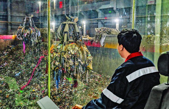 ◀运城市生活垃圾焚烧发电厂垃圾处理车间内,工作人员在操作垃圾吊抓斗,将充分发酵的生活垃圾投入焚烧炉。