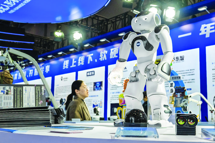▶11月21日,参观者在2025中国5G+工业互联网大会展厅参观人形机器人。 11月21日至23日,以“万物互联 智能领航”为主题的2025中国5G+工业互联网大会在湖北武汉举办。 新华社记者 杜子璇 摄