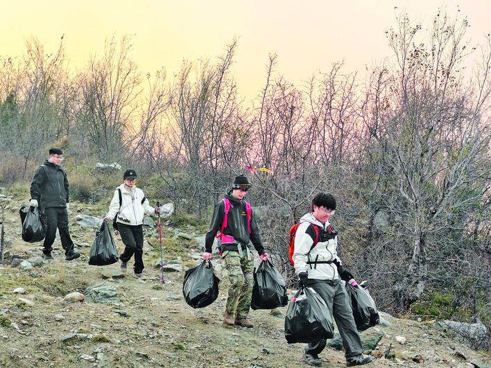 一路同行,记者听到了很多关于坚持的故事。登山爱好者杨晨说,户外运动带来自然之美,但文明同行同样重要。“我们呼吁广大登山徒步爱好者做到垃圾随身带、随手带下山,不给自然添负担。”他说,“山野是大家的,美景需要共同守护。也欢迎更多户外爱好者参与我们的清野净山行动,用脚步丈量风景,用行动守护生态。”