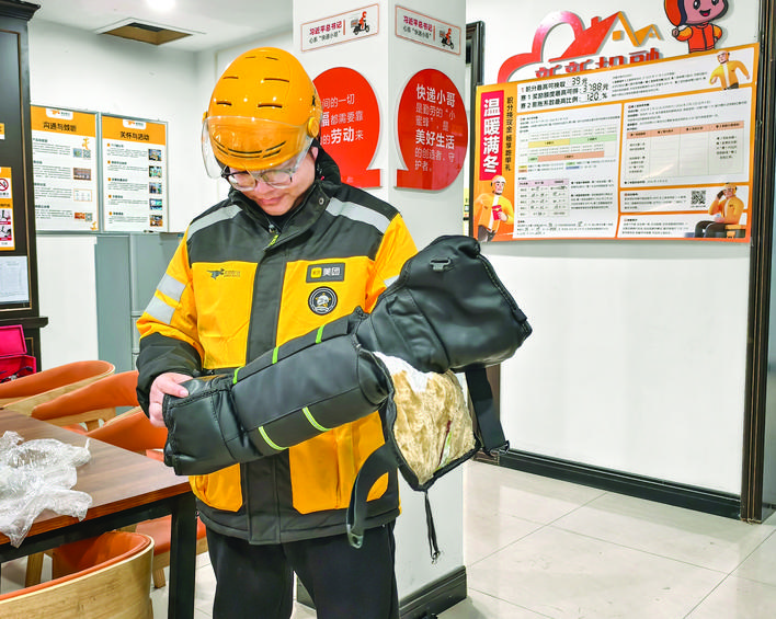 当天,市委社会工作部组织志愿者来到骑手之家,为一线从业者发放御寒物资“温暖大礼包”,包括保暖护膝、手套等。“党和政府都很关心这个行业,经常看望、慰问我们,大家就业更有信心和底气。”一名骑手表示。