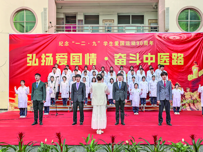 活动中,学生们带来《少年中国说》《祖国不会忘记》等歌曲,以青春活力点燃现场气氛。不少班级还创新表演形式,将中医理论知识融入其中,进一步弘扬优秀传统文化,将爱国热血融入中医传承使命。